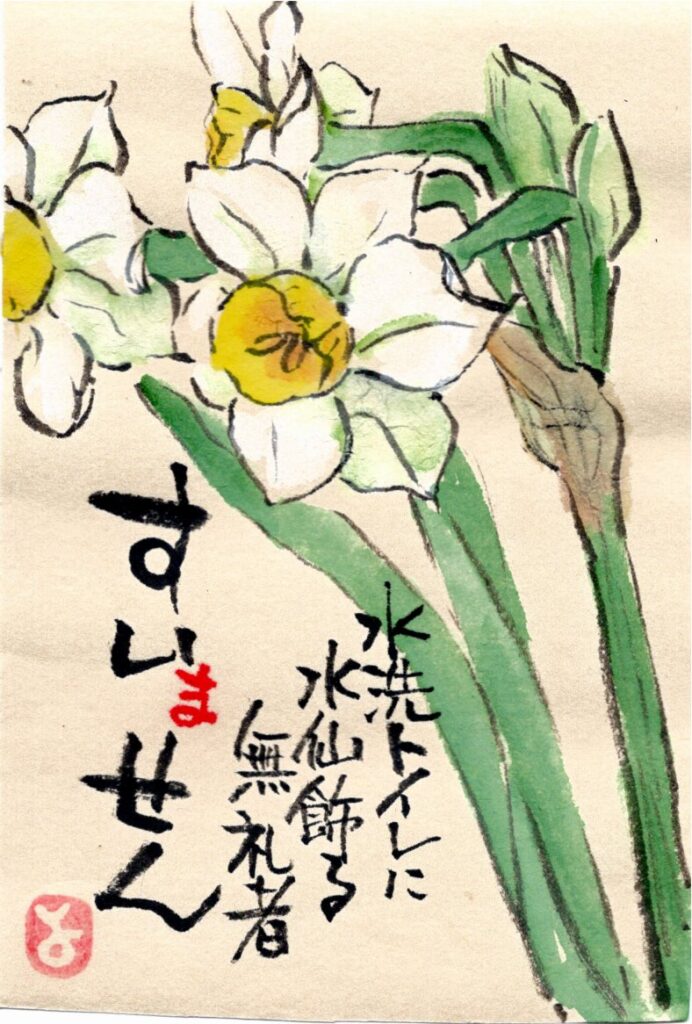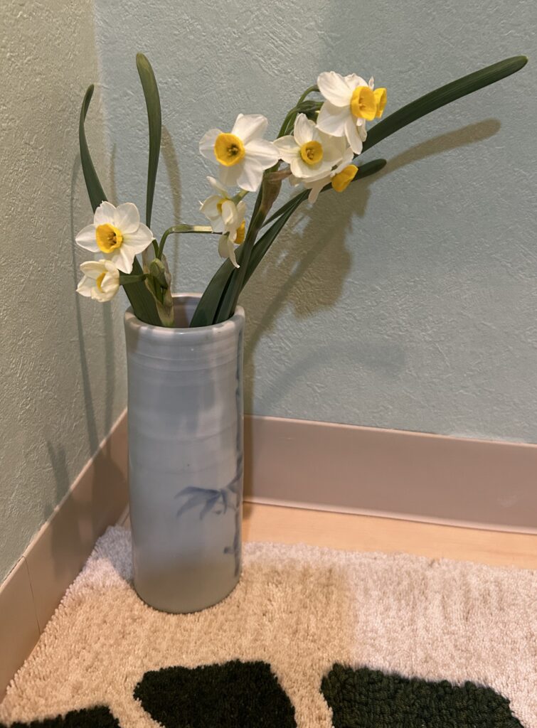 水仙の花言葉 自己愛、うぬぼれです 可憐な花ですね トイレに生け花 良いですね うちはザーッとしてるし ほったらかしだし 最後は無残な姿をさらしますんで こういうのはむいてないんです(悲)
