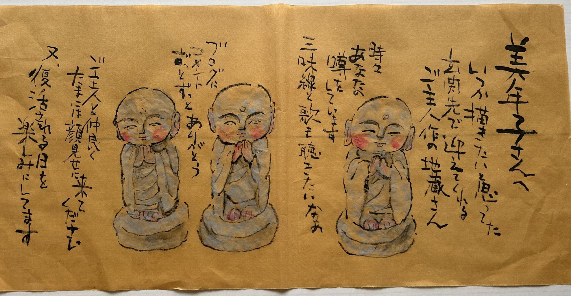 先日の地蔵さん、ミー猫さんへの手紙。馴染めない110円切手で封筒にて投函。