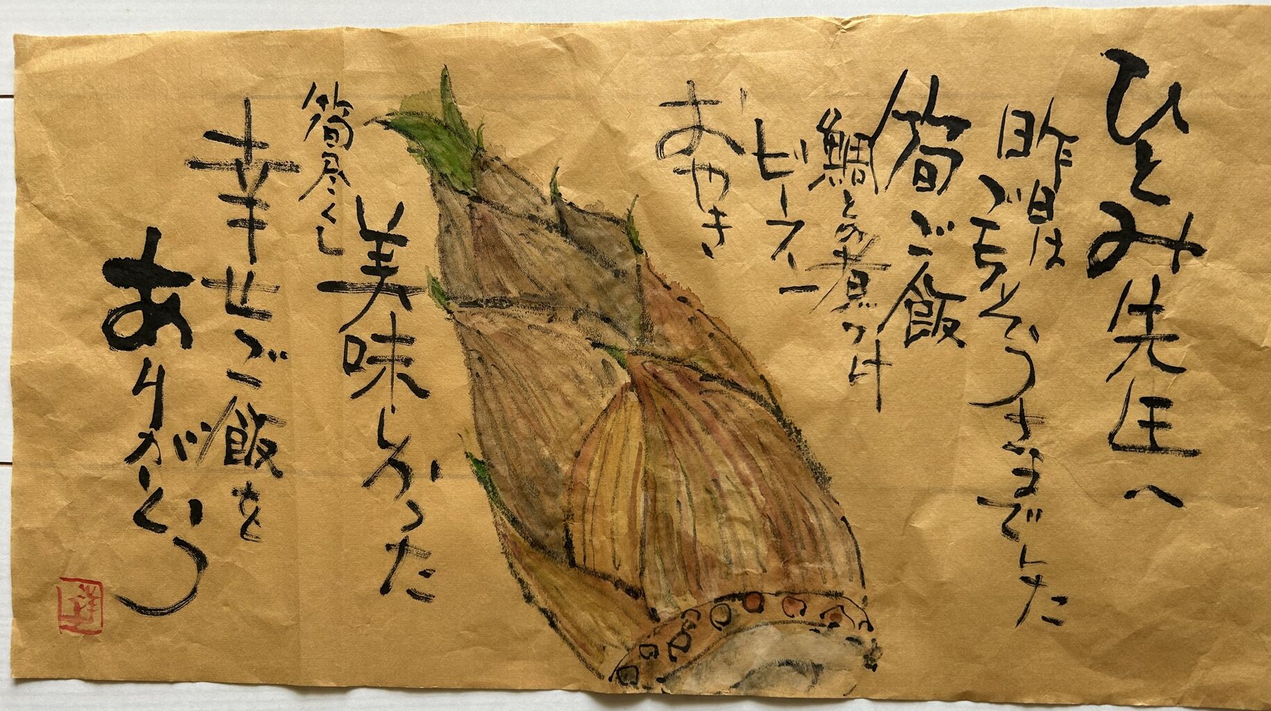 色和紙をたくさん頂き、有効活用。筍頂きに行き、夕飯まで頂く。