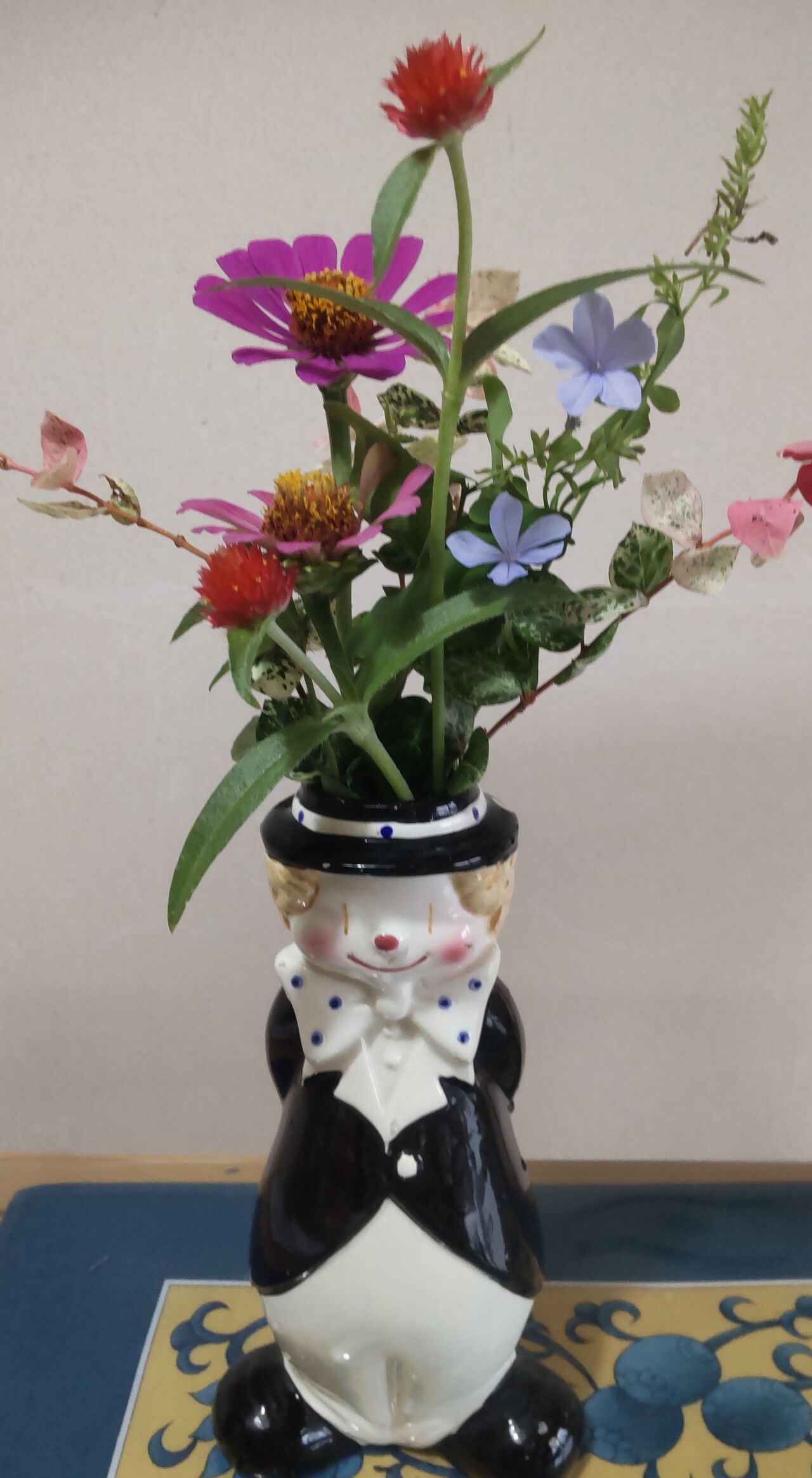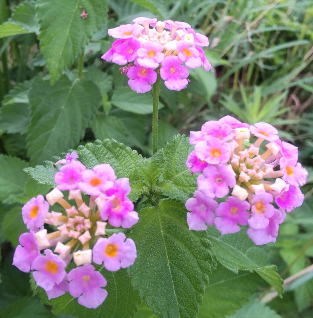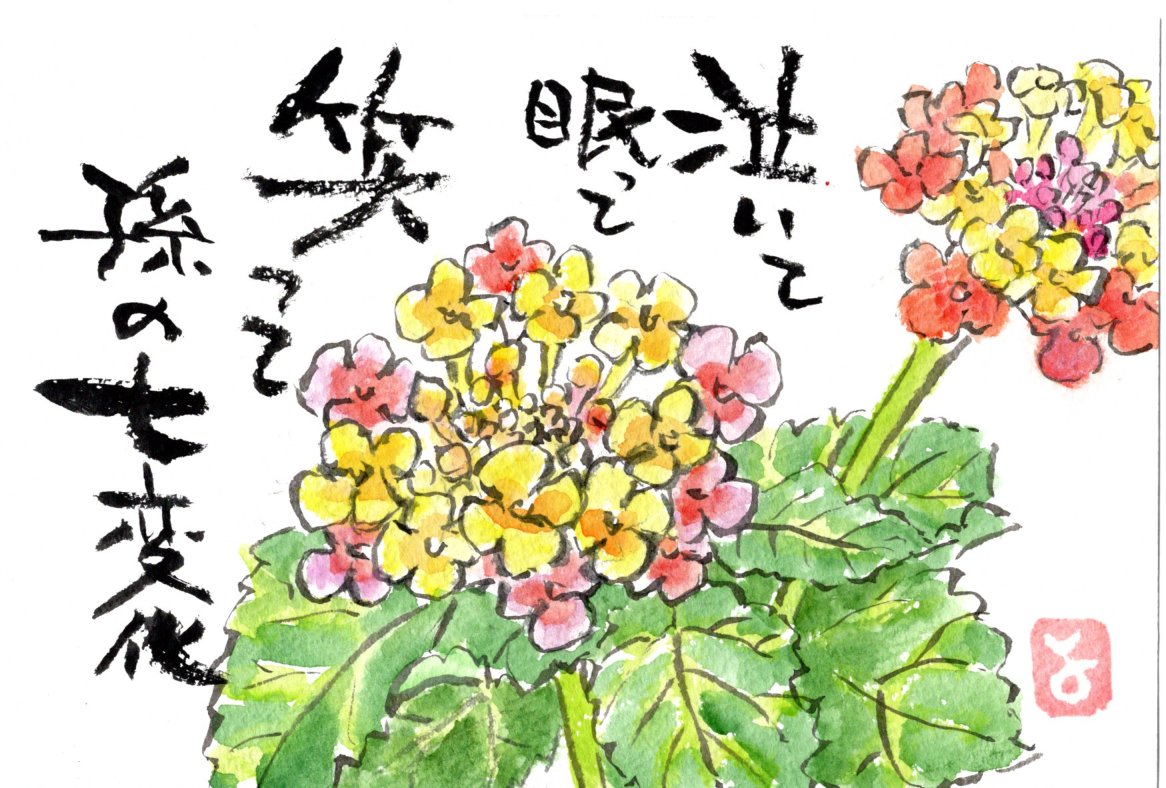色が変わる花、ランタナとも言う。生後一月半の孫は百面相。
