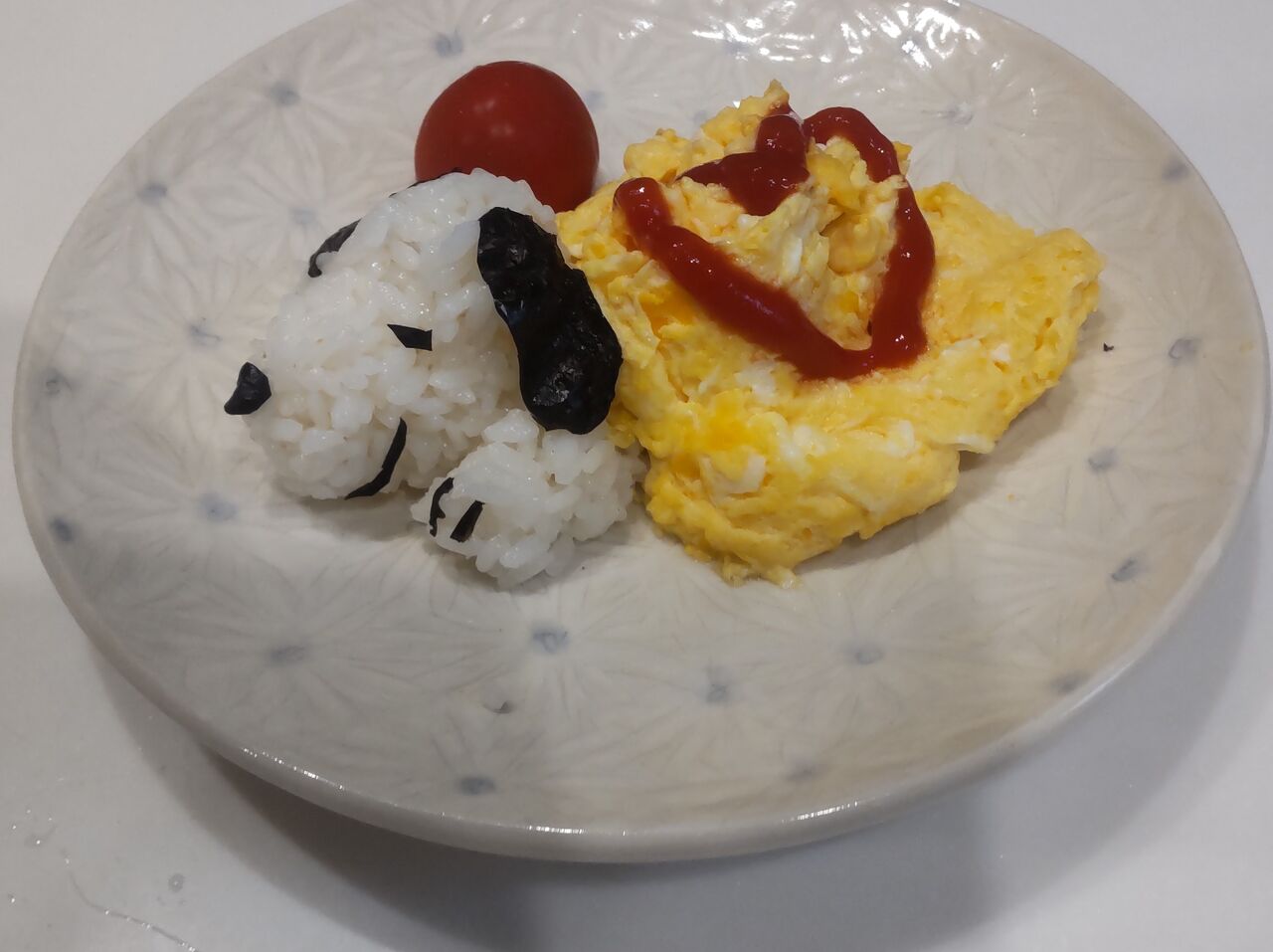 寝ぼけまなこの孫にサプライズ。ご飯、卵一個、海苔、ケッチャップで。