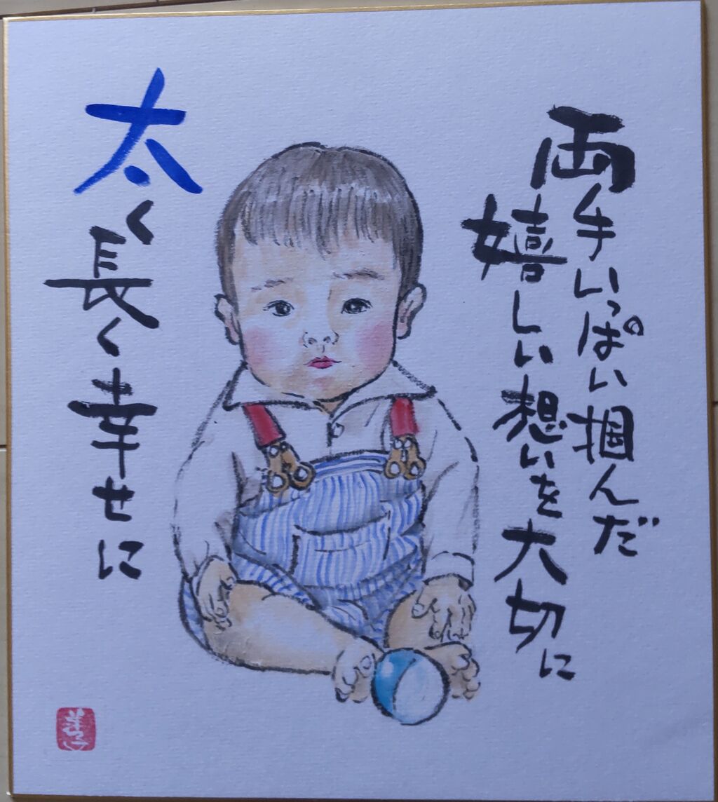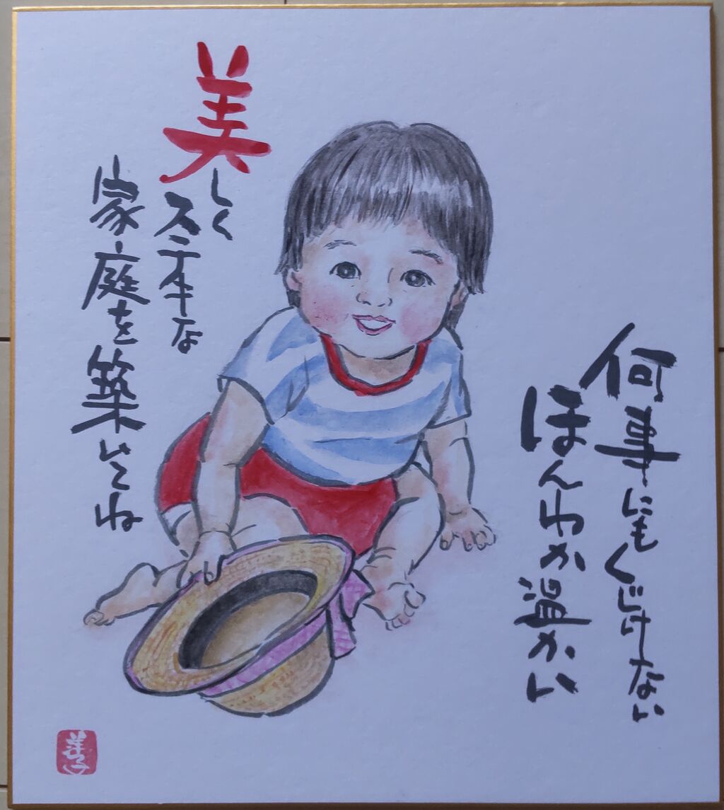 花婿花嫁の小さい頃の似顔絵を頼まれた。文章は花嫁の母と考えて。