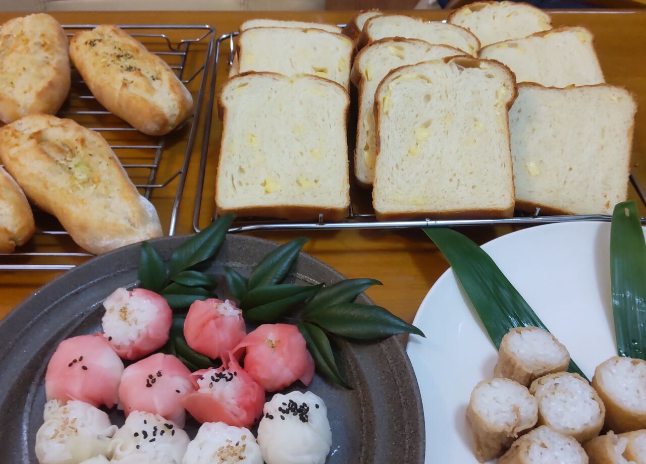 二月教室。左はガーリックバターソフトフランス。下は紅白手毬寿司と南関揚げ巻き寿司。