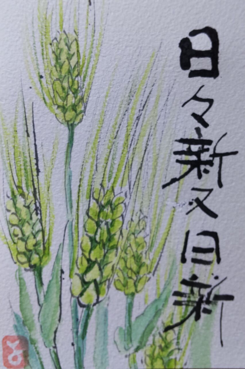 日々新たにして、また日に新たなり、という禅語。絵も字も麦で書いてみた。