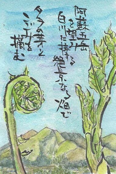 いつも高菜や米や野菜を持って来てくれるKさん。水と空気と景観に感激。