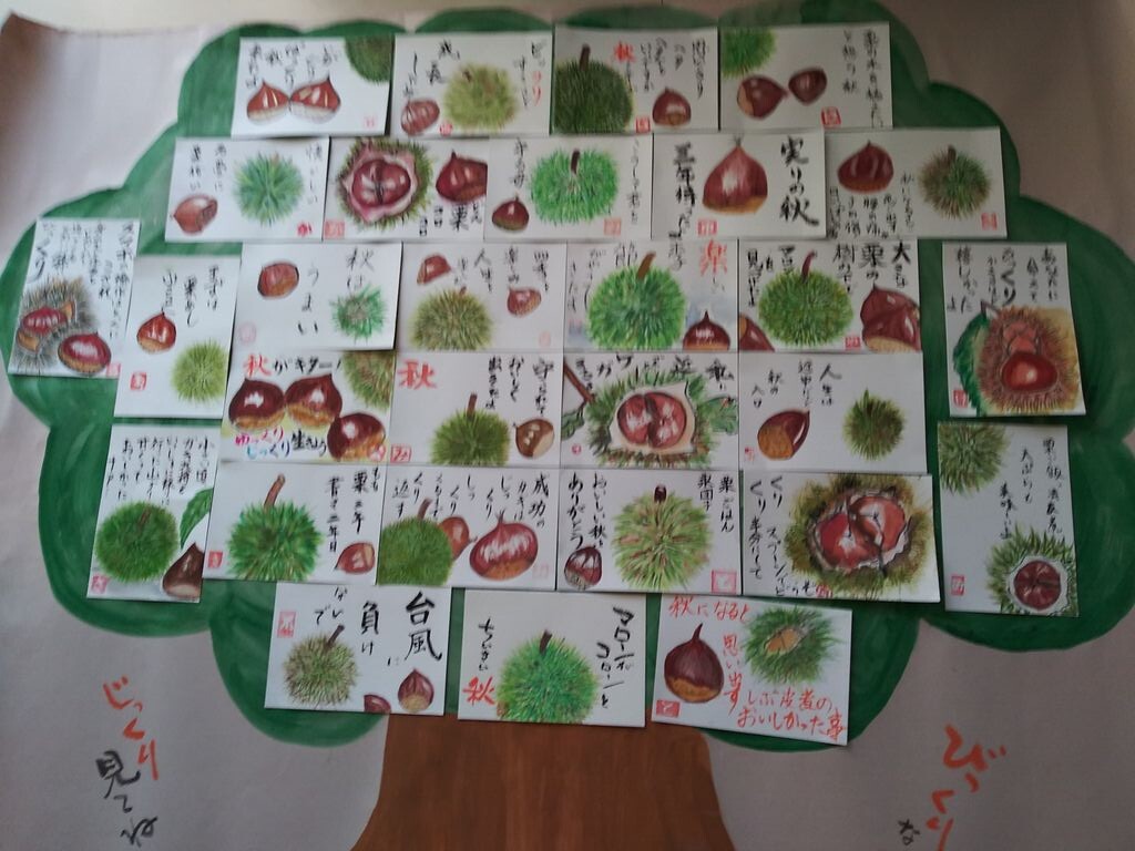 皆で描いた栗の絵を集めて、これぞビックリ(ビッグな栗)の木。それぞれ違う一枚。